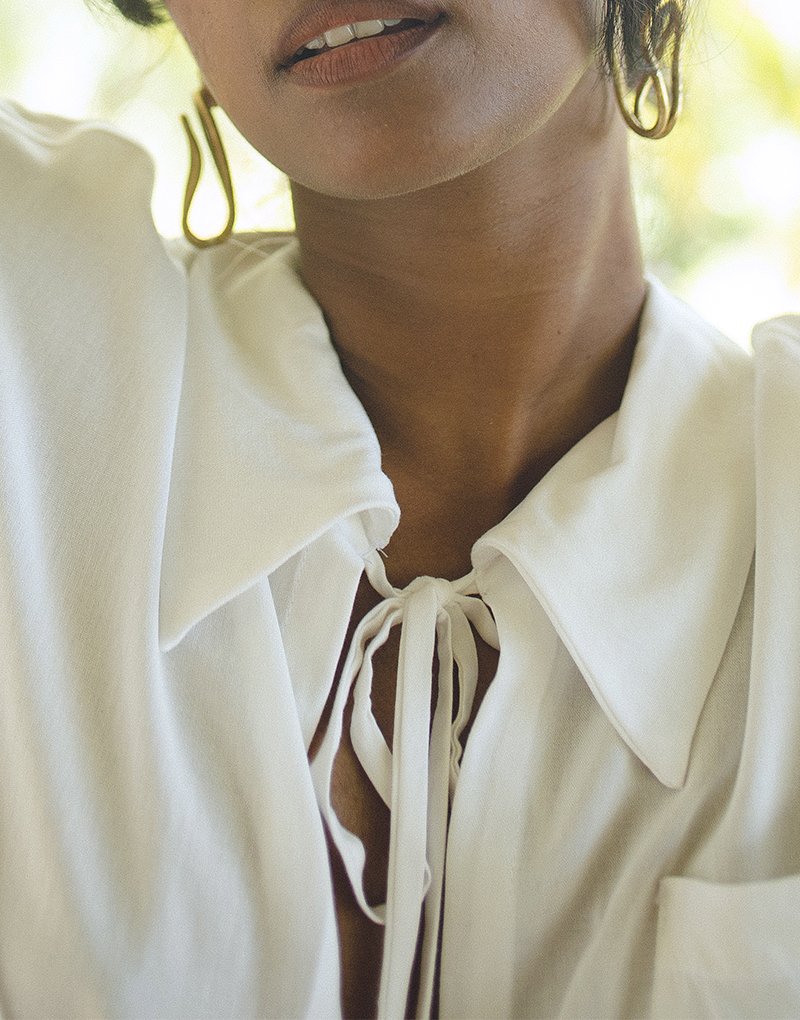 Features a tie-front neckline and adjustable sleeve ties, allowing subtle styling variations and a more open or closed look.