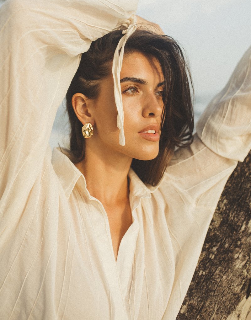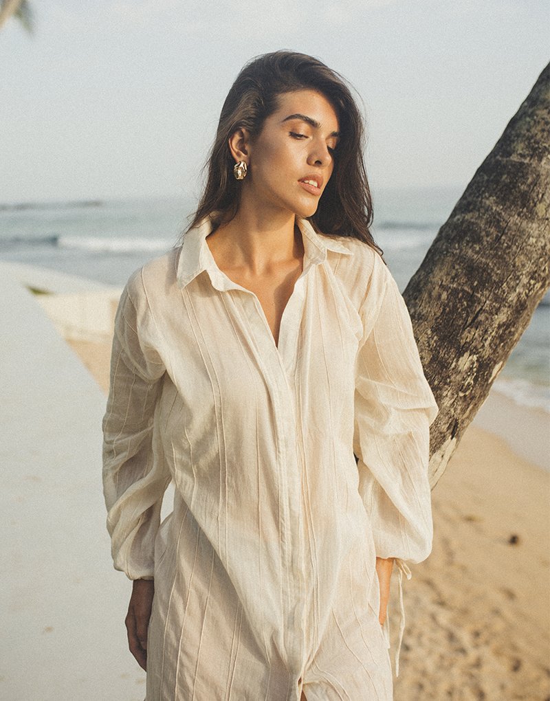 Relaxed shirt dress crafted from a very lightweight cotton blend with a soft, airy texture. Designed to create a fluid silhouette with a clean, natural feel.