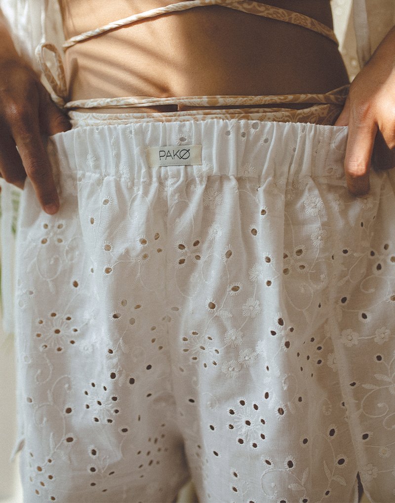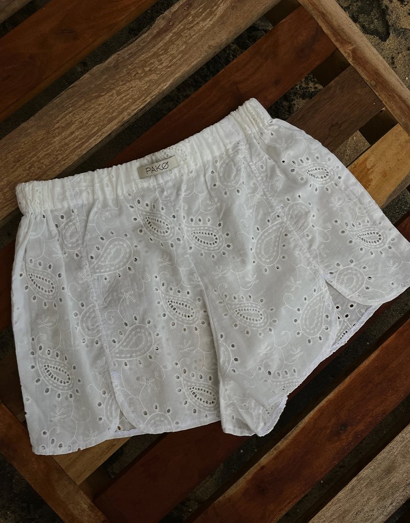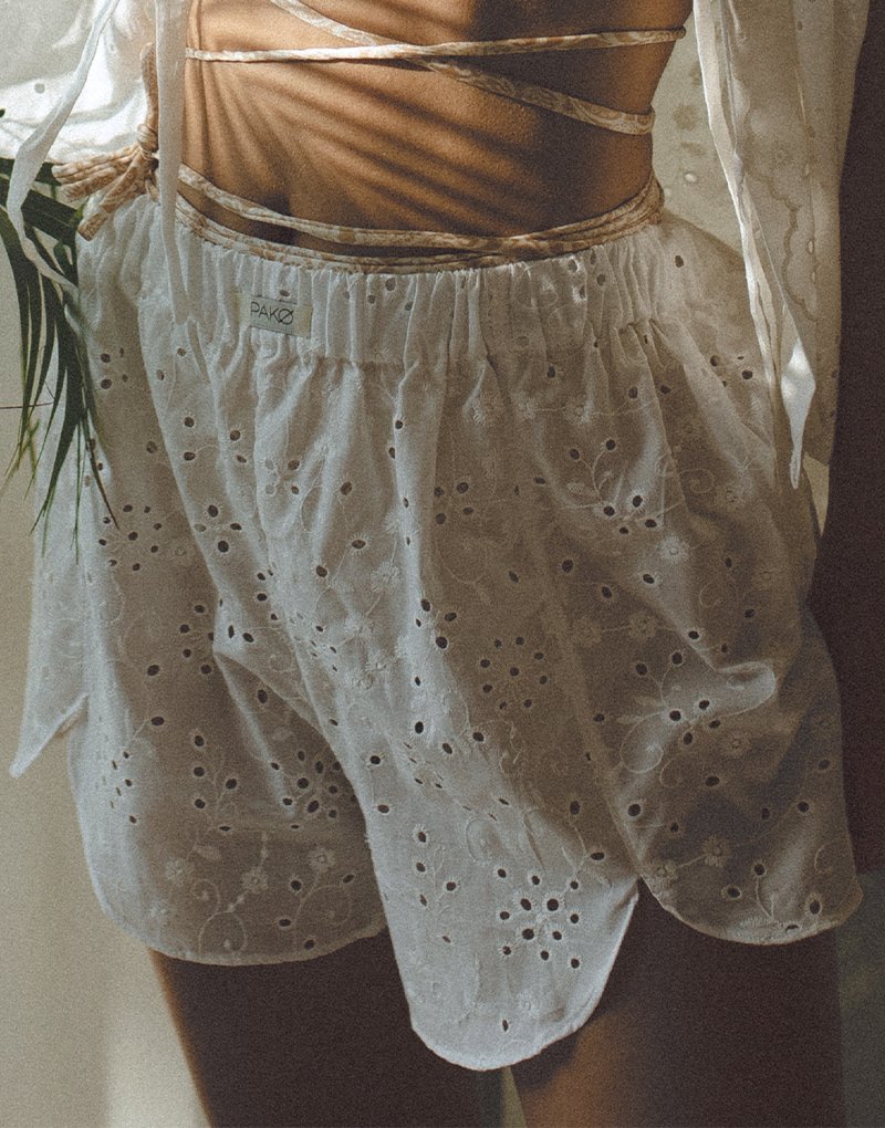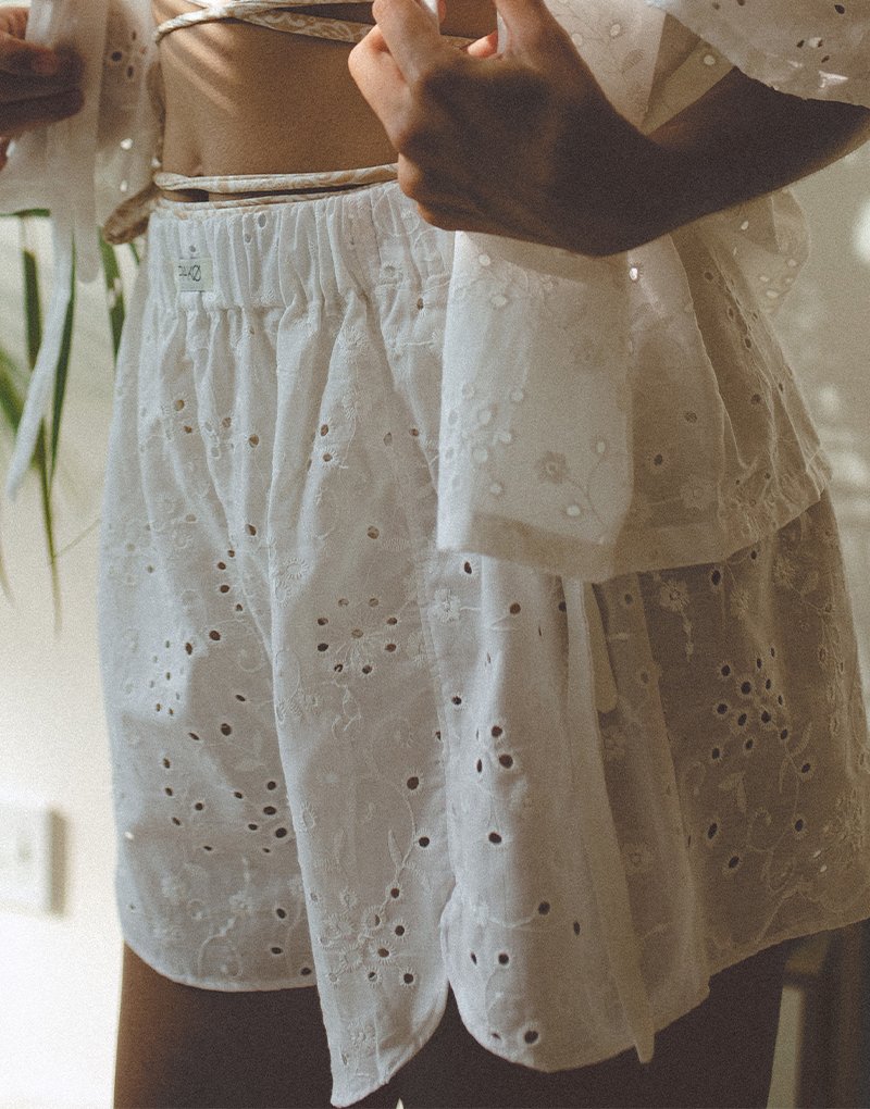 Lightweight shorts crafted from airy cotton lace with a soft, natural drape. The relaxed silhouette sits gently on the body, defined by a clean elastic waistband.