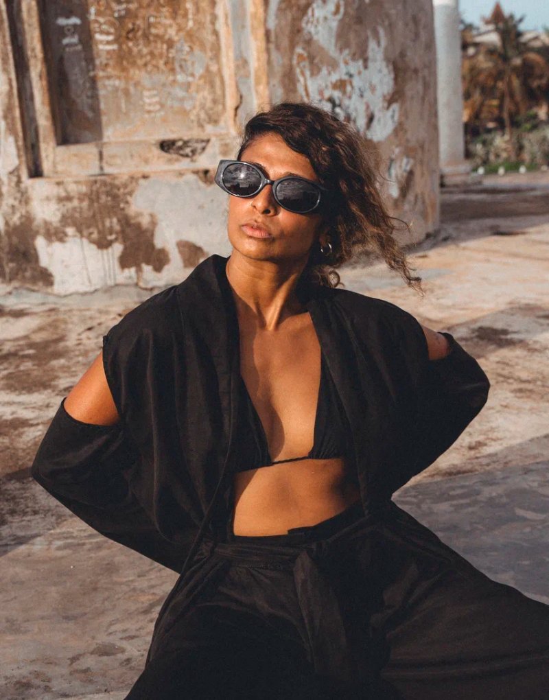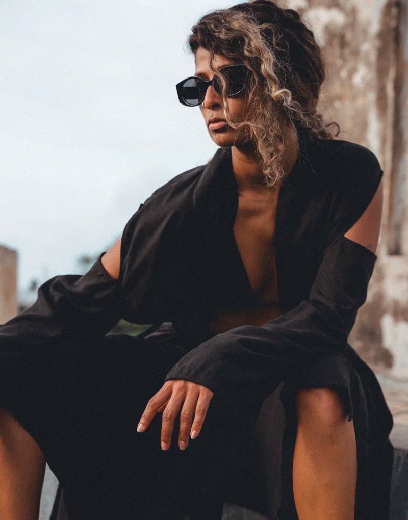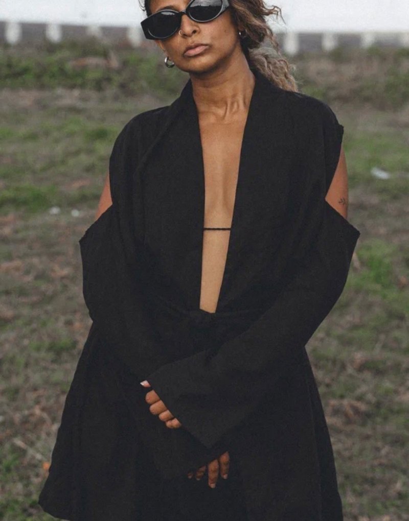 A structured yet fluid kimono jacket crafted from a breathable linen blend in deep black. Designed with a modern, architectural silhouette, it features open shoulder detailing that adds a bold, contemporary edge while keeping the look effortless and airy.